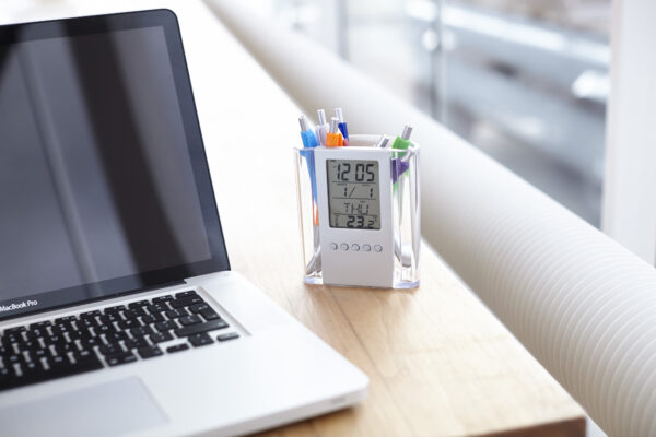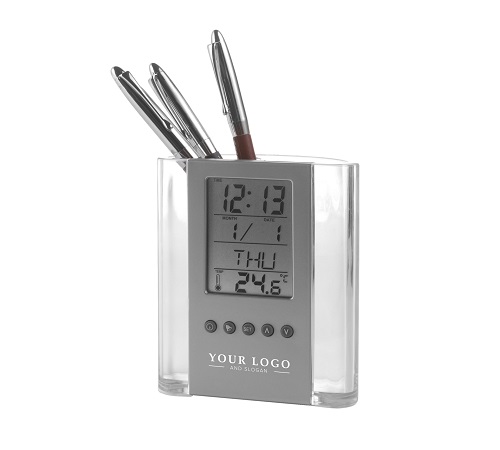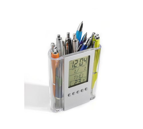 Χαρακτηριστικά: Transparent plastic pen holder with a calendar, alarm clock, and thermometer. Batteries included.