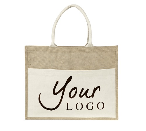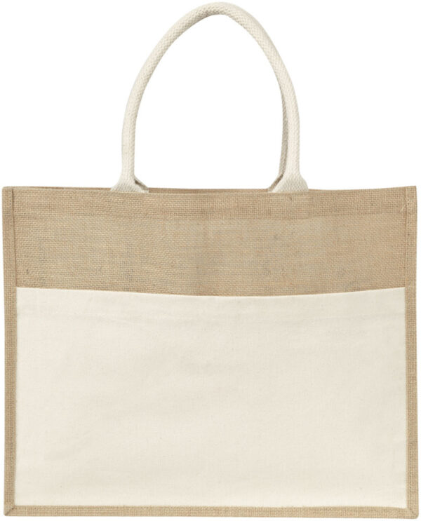 Χαρακτηριστικά: Jute bag with plastic backing, a cotton front pocket, and padded carry handles.