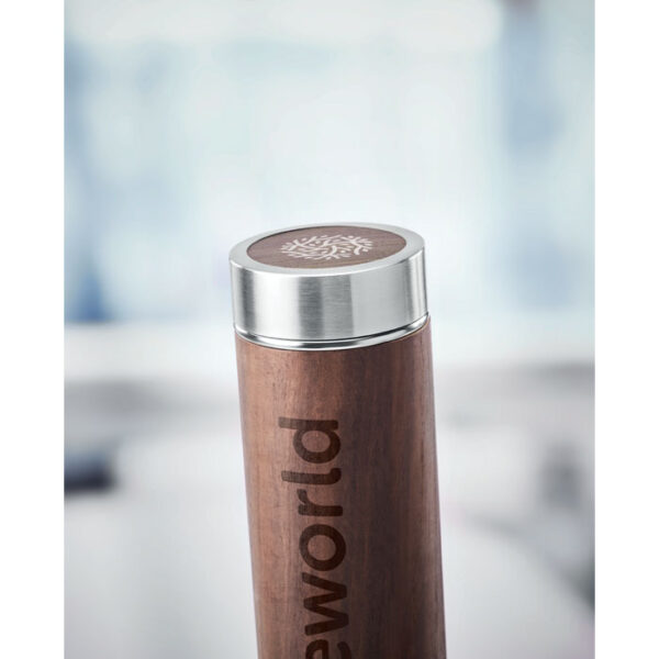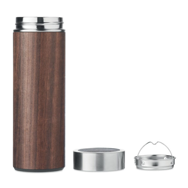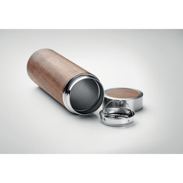 Χαρακτηριστικά: Double wall stainless steel insulating vacuum flask with oak wood cover and additional tea infuser. Capacity: 400ml. Bring your favourite coffee, tea or other hot drink with you on the road in this natural looking, insulated bottle. It has a tea infuser, so you can make your own fresh tea directly in the flask itself. Oak wood is a natural product, there may be slight variations in colour and size per item, which can affect the final decoration outcome.