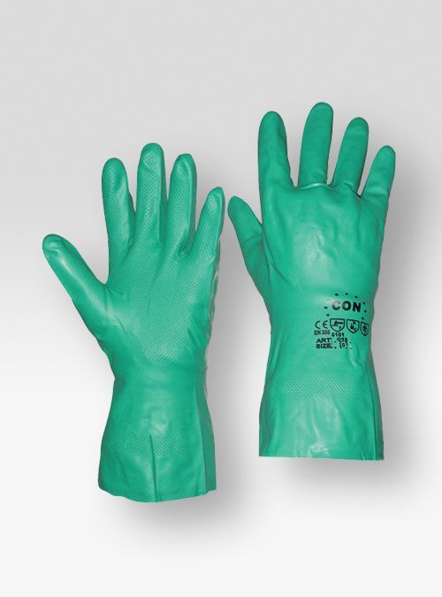 Γάντια εργασίας από nitrile πράσινου χρώματος. Παρέχουν προστασία από χημικά, ισχυρά καθαριστικά, διαλύτες και λάδια. Για βιομηχανική χρήση.