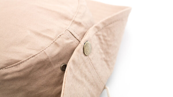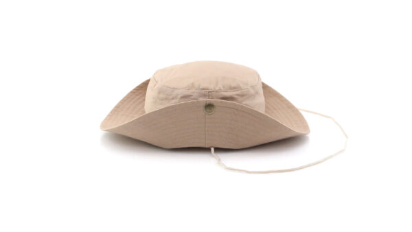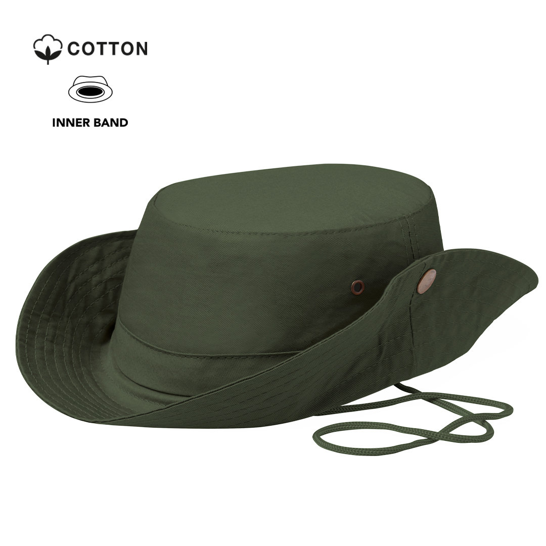 Χαρακτηριστικά: Safari hat in 100% cotton material. Comfortable inside and with lateral ventilation holes reinforced with metal rings. Adjustable wing with metal closures and matching color carrying cord. 100% Cotton