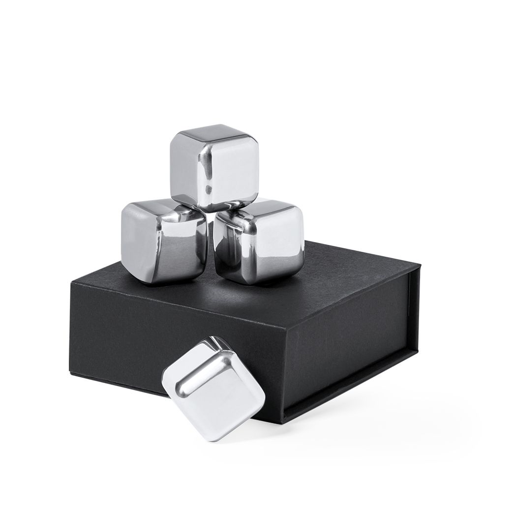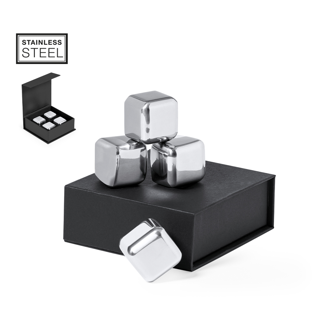Χαρακτηριστικά: Set of 4 reusable ice cubes. Made of stainless steel, keeping the drink cold without altering its properties by not diluting its content in water, as well as maintaining its original flavour. Presented in an elegant black case with inside die cut. Reusable. 4 Pieces. Stainless Steel
