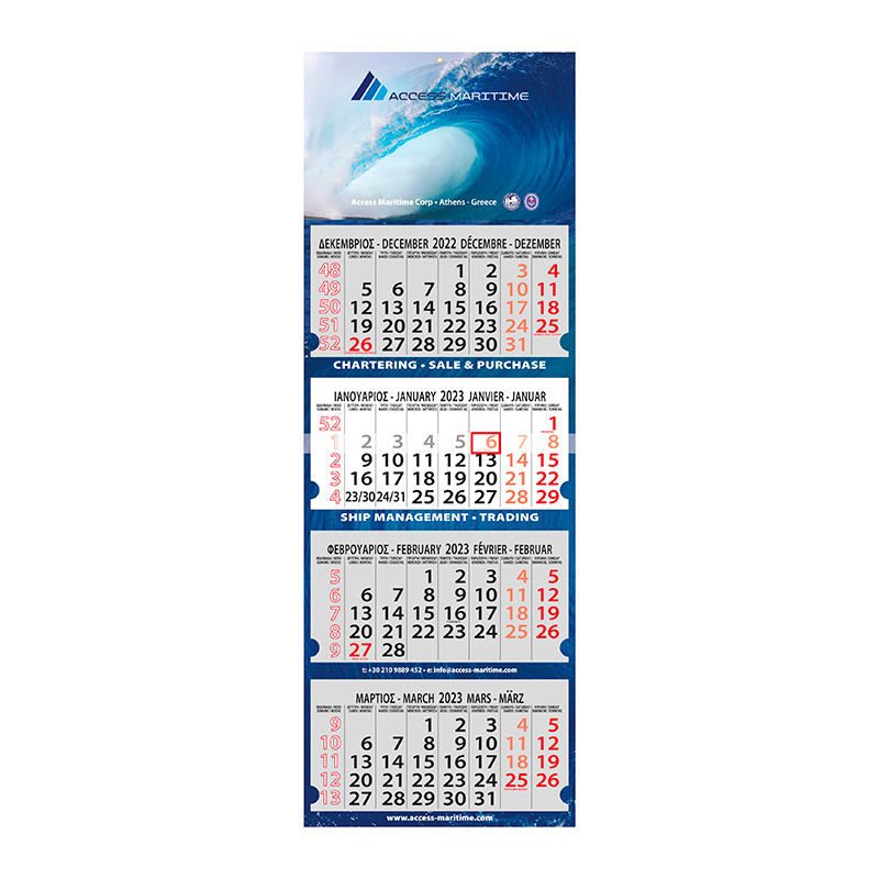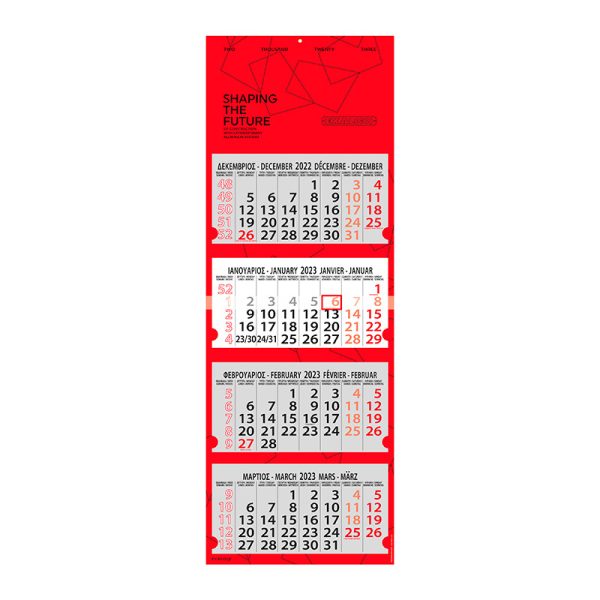 Χαρακτηριστικά: Τετράμηνο ημερολόγιο τοίχου για τον τρέχοντα, τον προηγούμενο και τους 2 επόμενους μήνες. Κάθε φύλλο έχει ημερολόγιο όλου του μήνα με τις σημαντικές αργίες και εβδομάδες του κάθε μήνα. Κάθε ημερολόγιο φέρει δαχτυλίδι για τοποθέτηση στον τοίχο και διαφανείς λωρίδα με κόκκινο pvc για την ημέρα. Συσκευασία : Μπορεί να συνδυαστεί με ατομικό φάκελο