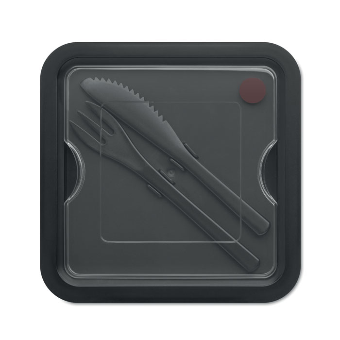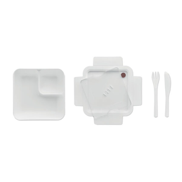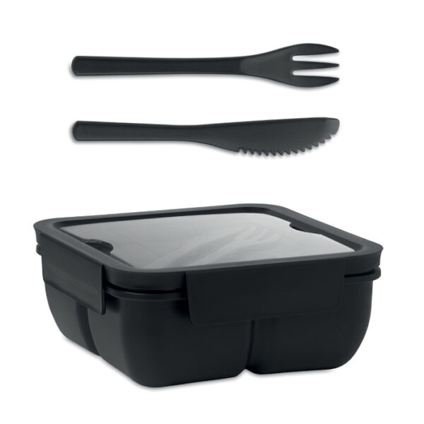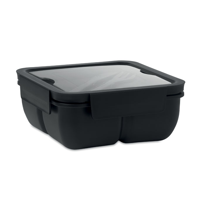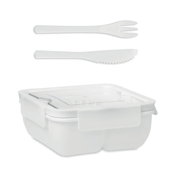 Χαρακτηριστικά: Lunch box in PP with 2 compartments and PP cutlery set. Bring a healthy homemadelunch with you to work in this PP lunch box. With two compartments you can bringtwo seperate foods or ingredientes without them getting mixed up. In the lid youwill find a PP knife and fork so you can eat your lunch. Capacity 600 ml.
