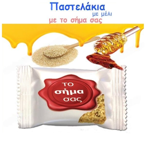 Χαρακτηριστικά: Παστελάκια Μελιού mini μαλακά, (μελεκούνια), τυπωμένα με το λογότυπο σας. Υψηλής ποιότητος. Ολόφρεσκα. Περιέχουν μόνο Σουσάμι, Μέλι, Κανέλα και ξύσμα πορτοκαλιού. Δίχως αρωματικές και χρωστικές ύλες και δίχως ζάχαρη. Εκτύπωση Έγχρωμη με το λογότυπό σας ή ό,τι άλλο, στο περιτύλιγμα τους (περιτύλιγμα λευκής απόχρωσης, όχι ολόλευκο). Συσκευασμένο: 74 Χ 46 Χ 12 mm.