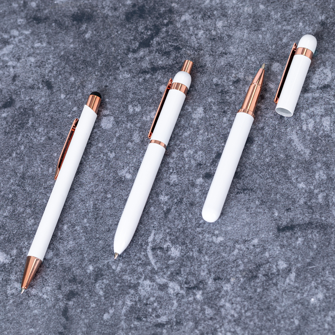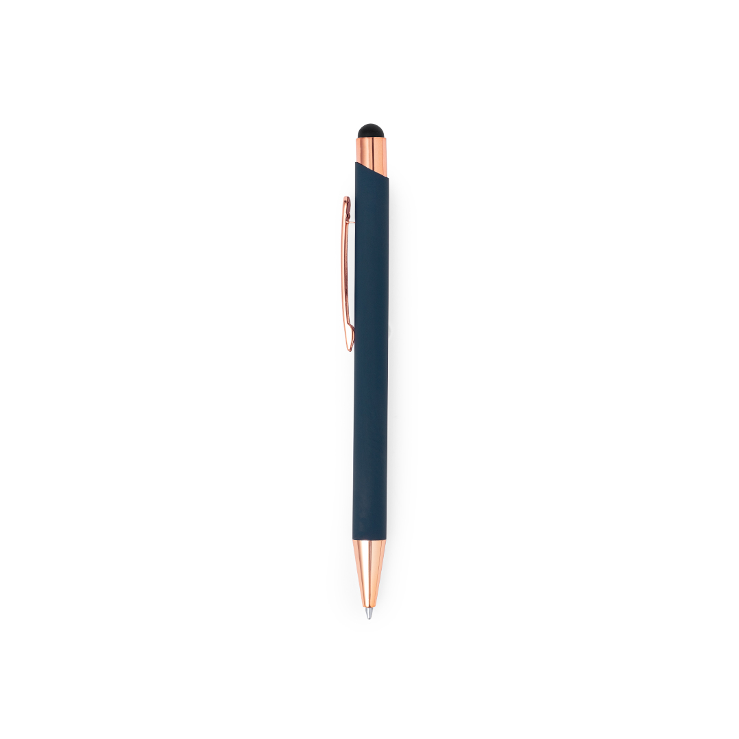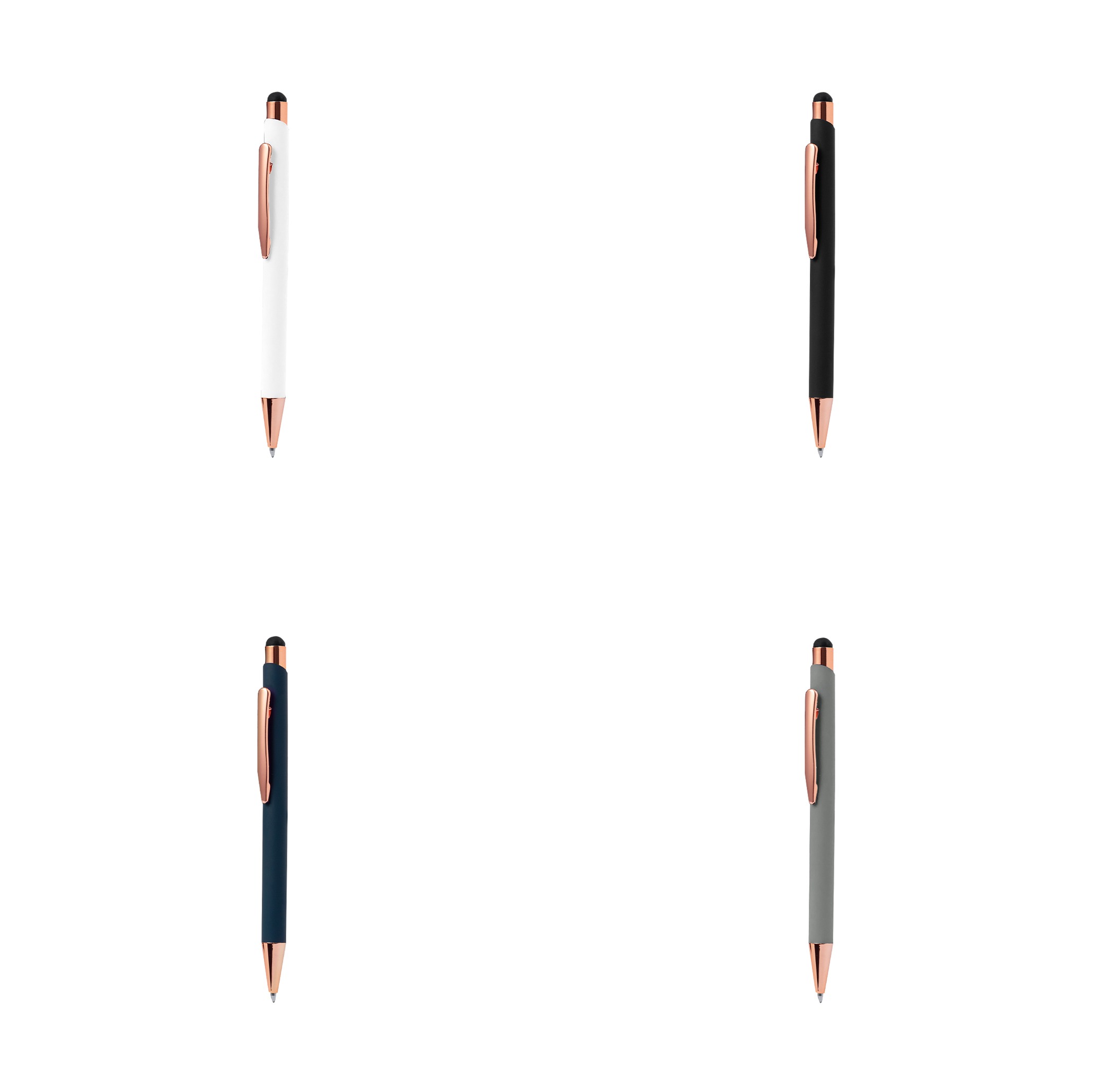 Χαρακτηριστικά: Rubber touch ball pen specially designed for laser marking with rose-coloured logo. Push-button mechanism, with metal clip and copper-plated fittings. Barrel available in 4 distinguished colours, jumbo cartridge and blue ink. Presented in an elegant black design box. Jumbo Refill. Aluminium