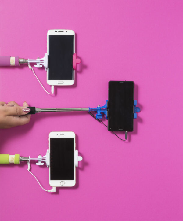 Χαρακτηριστικά: ABS telescopic selfie stick, expandable to a maximum length of 61 cm, with an EVA foam handle. Including a selfie shutter button on the handle and cable with plug, approx. 33 cm long.