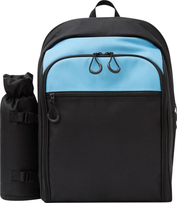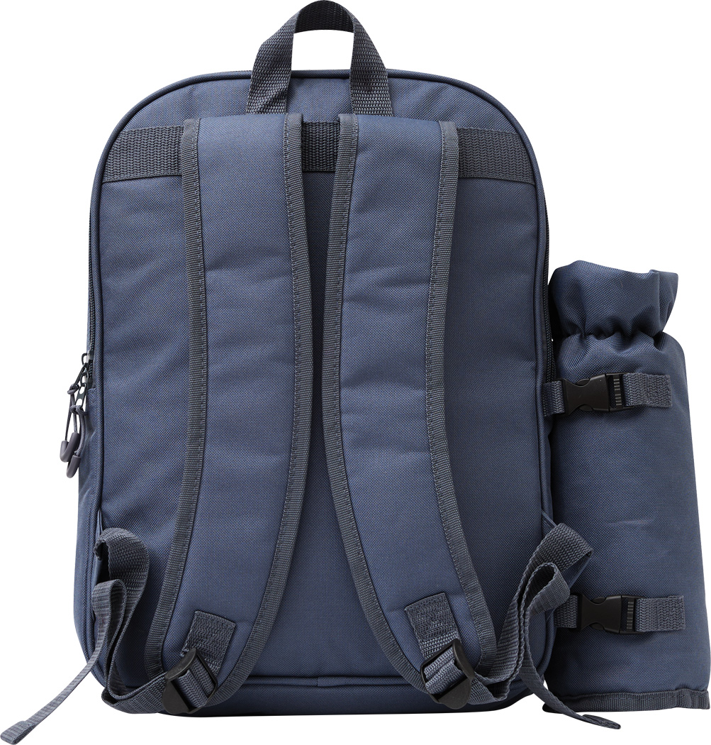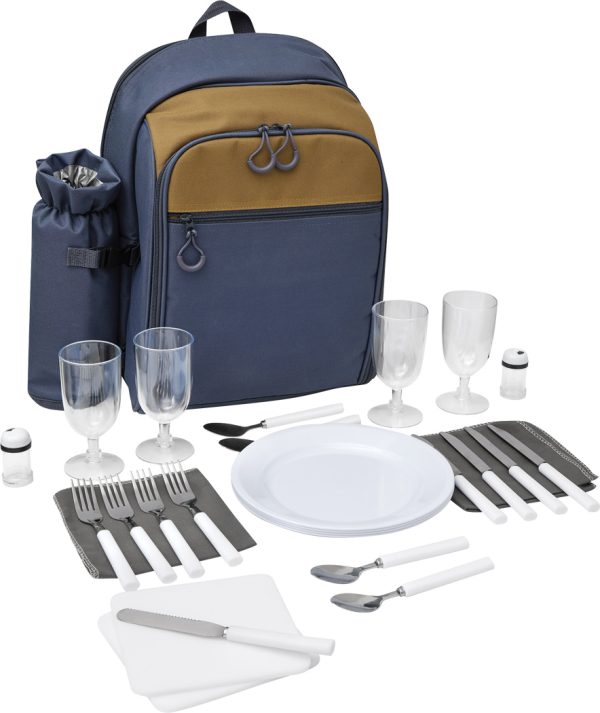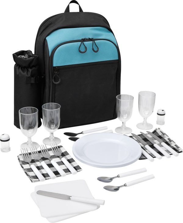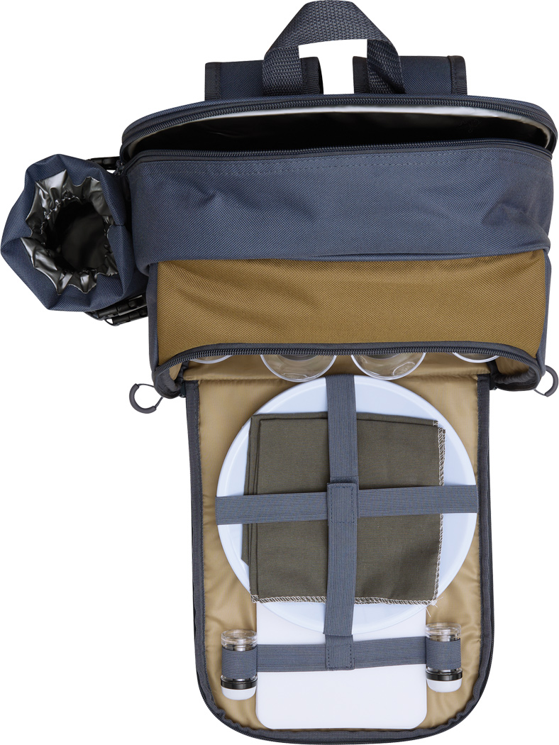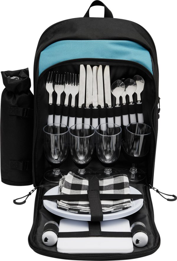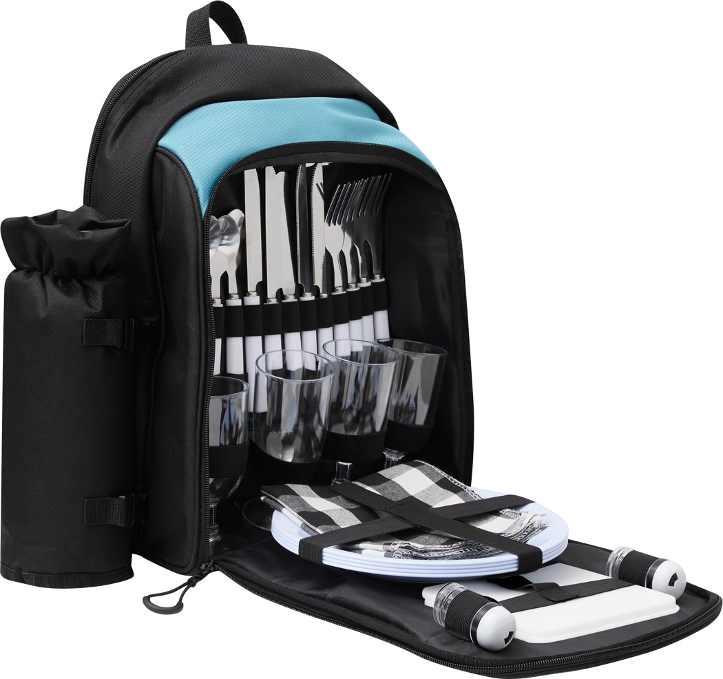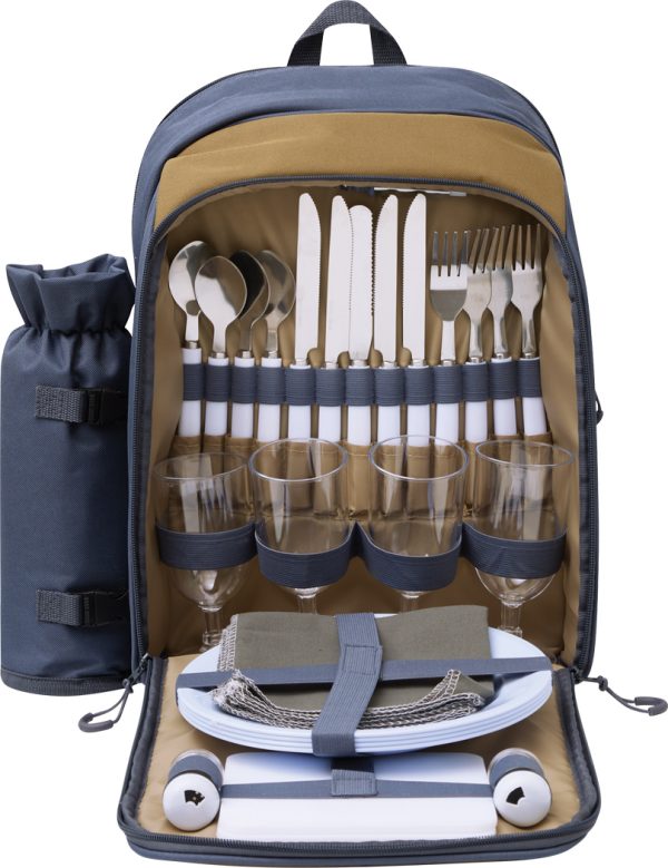 Χαρακτηριστικά: For 4 people: insulated main compartment with zip, middle compartment with zip incl. stainless steel cutlery with plastic handles, 4 plastic glasses and plates, 4 cloth napkins, salt and pepper shakers, front compartment with zip, carrying loop, padded shoulder straps, 1 detachable insulated bottle holder on the side