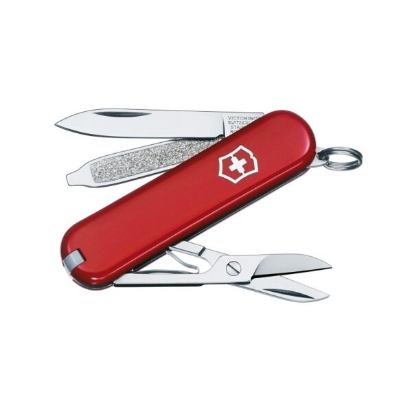 Χαρακτηριστικά: Victorinox pocket knife with seven functions: toothpick, scissors, tweezers, nail file, screwdriver (2.5 mm), key ring, and a small blade. Individually packaged in gift box.
