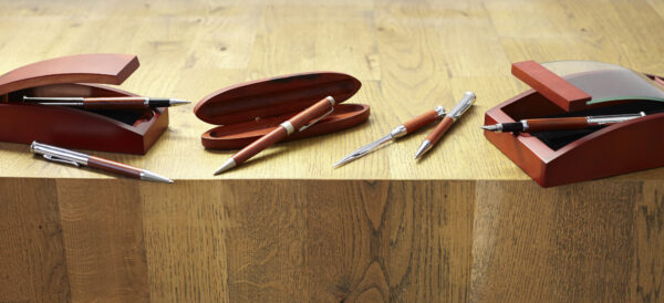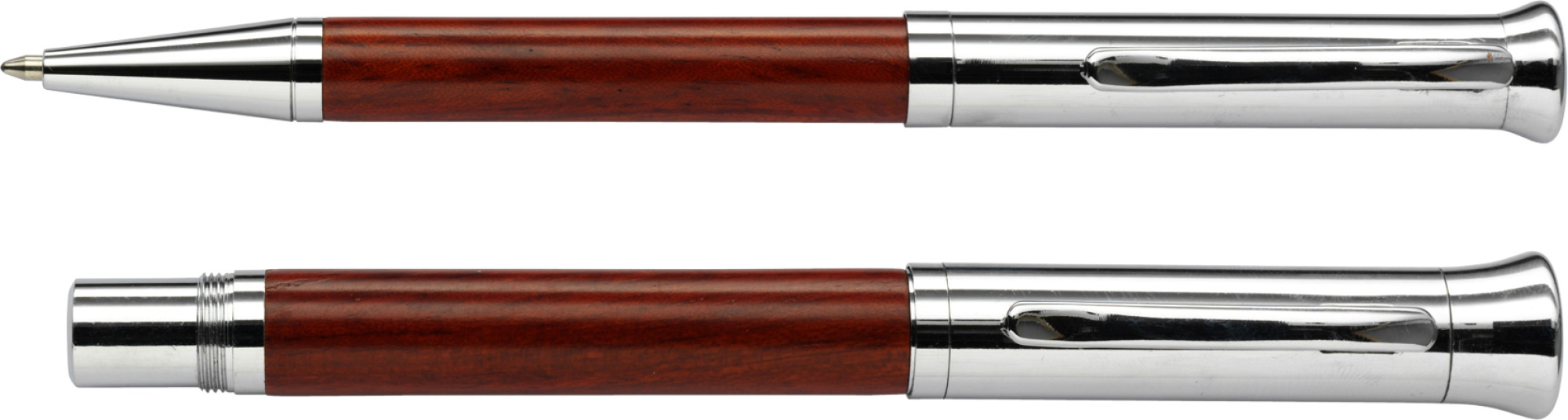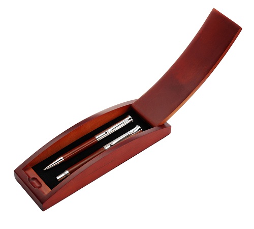 Χαρακτηριστικά: Rosewood and metal writing set consisting of a ballpen and rollerball pen. Packaged in a birchwood pen case. Black ink.